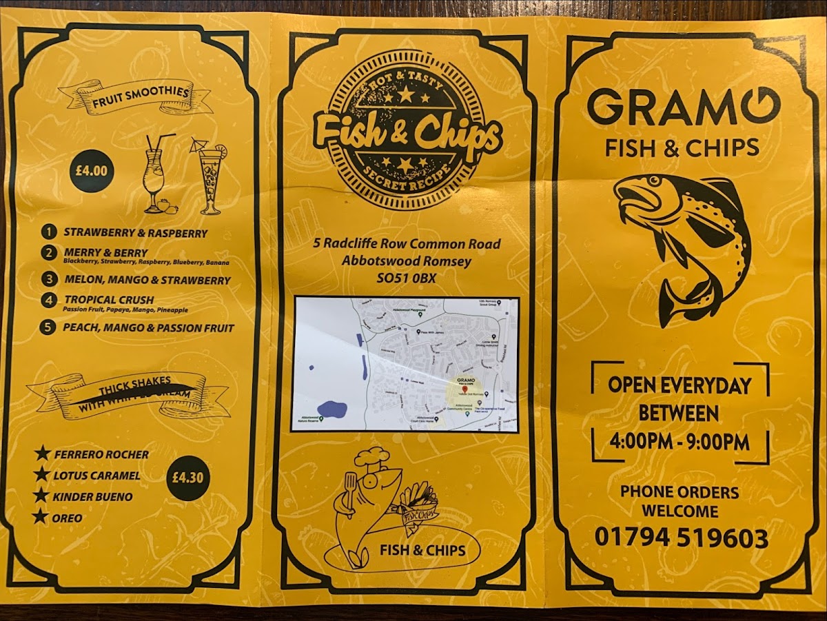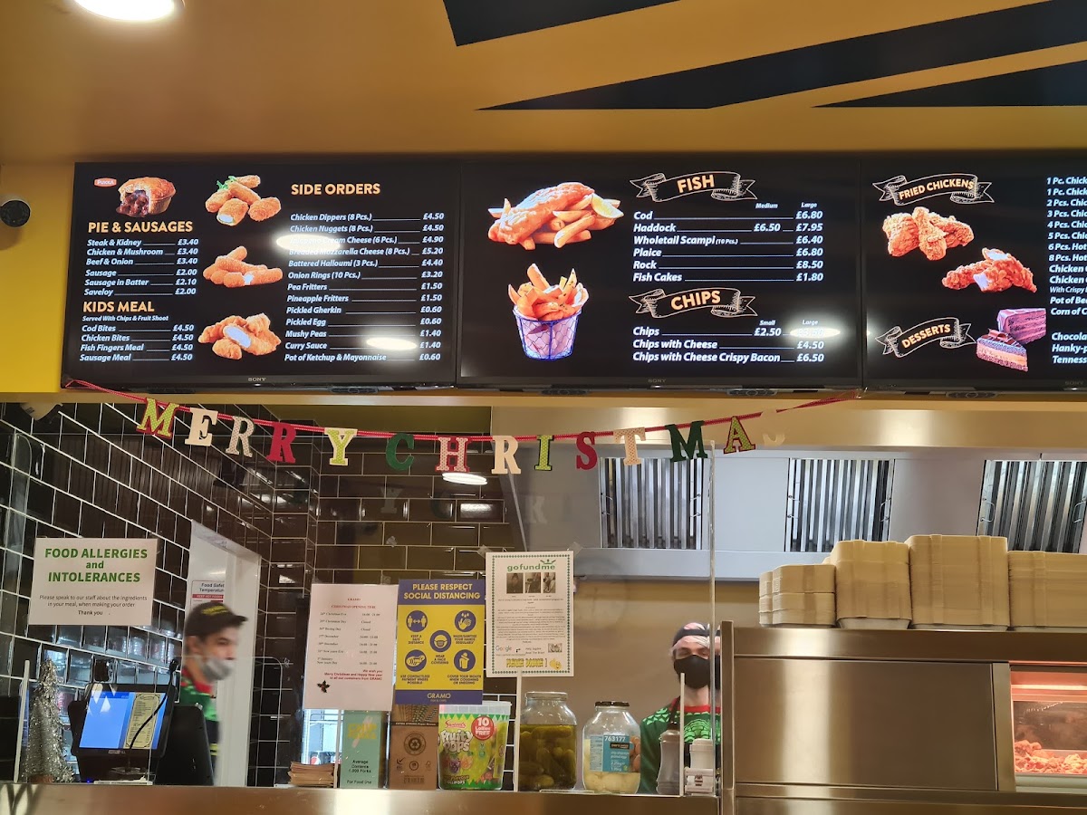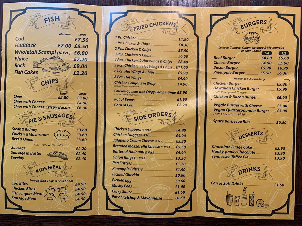 The menu at Gramo Fish & Chips offers a wide range of comforting and satisfying options, catering to all tastes. For seafood lovers, there's a selection of fish, including Plaice, Rock, Cod, and Haddock, with Fish Cakes also available. You can enjoy these with Chips or opt for a twist with Chips with Cheese or Chips with Cheese & Crispy Bacon. If you're in the mood for something heartier, the Steak & Kidney and Chicken & Mushroom pies, as well as the Beef & Onion Sausage and Sausage in Batter, are great choices. For those craving fried chicken, options range from 1 Pc. Chicken to the generous 4 Pcs. Chicken or combinations like 2 Hot Wings & Chips. The side orders add more variety, with Chicken Dippers, Chicken Nuggets, and Jalapeno Cream Cheese offering a perfect snack or addition to your meal, alongside Breaded Mozzarella Cheese and Battered Halloumi. Burgers are also featured, with favorites like the Beef Burger, Cheese Burger, and the more unique Pineapple Burger. For dessert, Chocolate Fudge Cake, Hanky-Panky Chocolate, and the indulgent Tennessee Toffee Pie are sure to satisfy any sweet tooth. The drinks menu includes a variety of Soft Drinks and refreshing Fruit Smoothies, such as Strawberry & Raspberry and Mango & Passion Fruit. The Thick Shakes, like Ferrero Rocher and Oreo, are a great treat to pair with your meal. Kids have their own selection, with Cod Bites and Chicken Bites meals, and there’s even a tasty Chicken Goujons Wrap for a lighter bite. Gramo Fish & Chips provides a diverse and flavorful menu with something for everyone to enjoy.